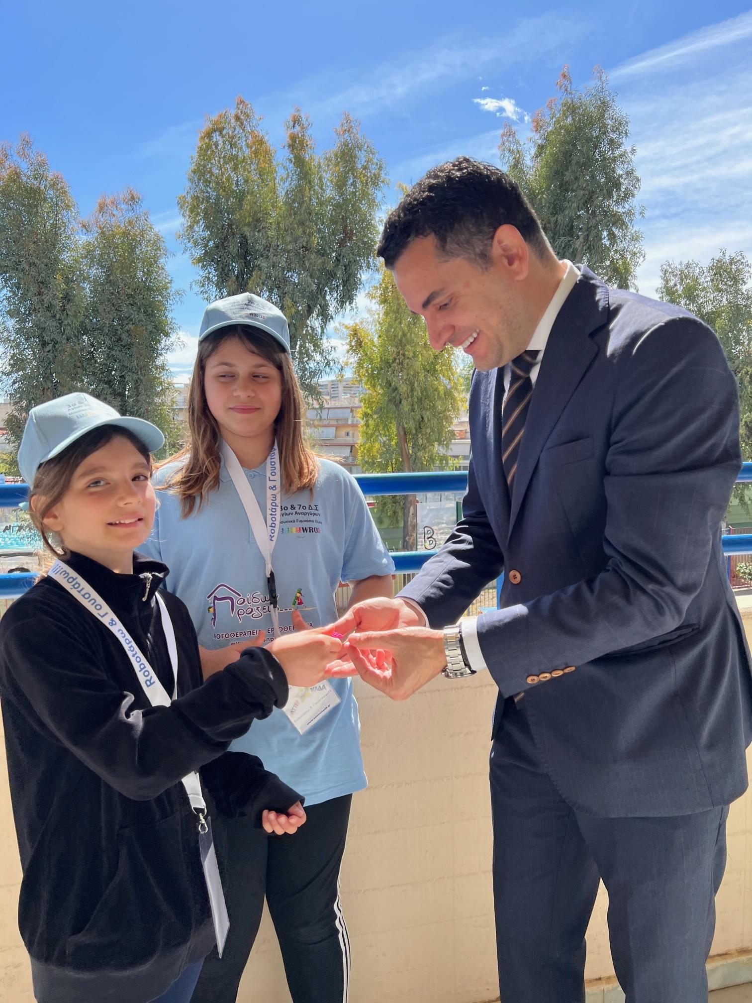 Ο Δήμαρχος ενημερώθηκε για τις δυνατότητες που προσφέρει ο διαδραστικός πίνακας, φωτογραφήθηκε με τους μικρούς μαθητές και στο περιθώριο της επίσκεψης δέχτηκε ένα αναμνηστικό δώρο από δύο μικρές μαθήτριες της ρομποτικής.
