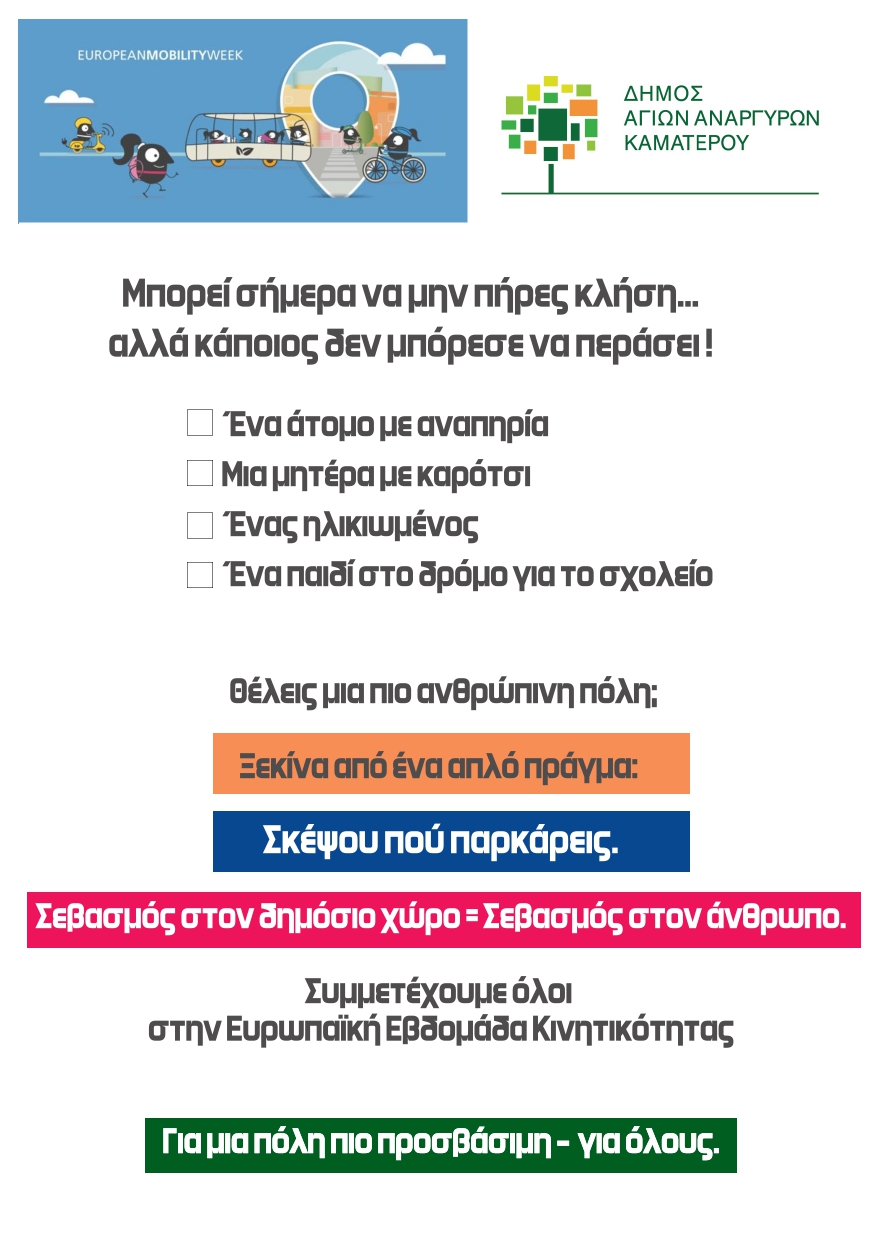 Ο Δήμος Αγίων Αναργύρων – Καματερού καλεί τους πολίτες να συμμετέχουν ενεργά σε όλες τις δράσεις της Ευρωπαϊκής Εβδομάδας Κινητικότητας, ώστε ενωμένοι ως τοπική κοινωνία να αξιοποιήσουμε τους ελεύθερους χώρους, να προάγουμε την ποιότητα ζωής και την ευημερία, και ταυτόχρονα να μειώσουμε το περιβαλλοντικό μας αποτύπωμα.