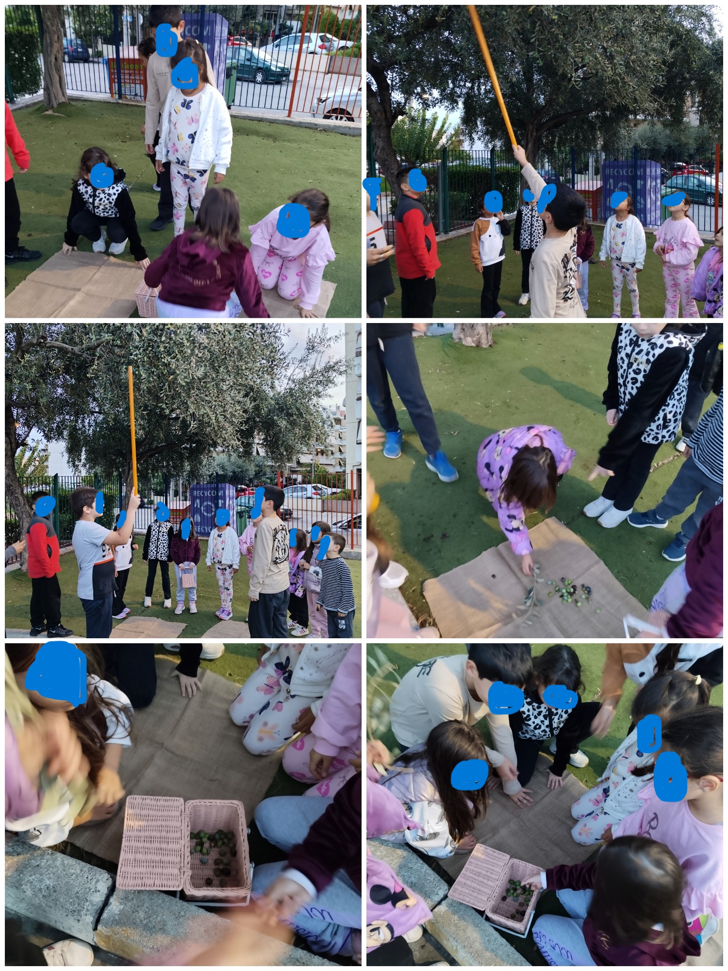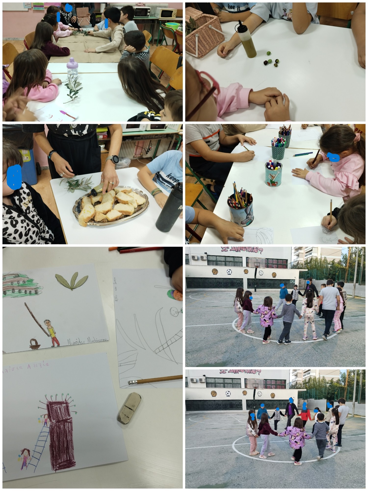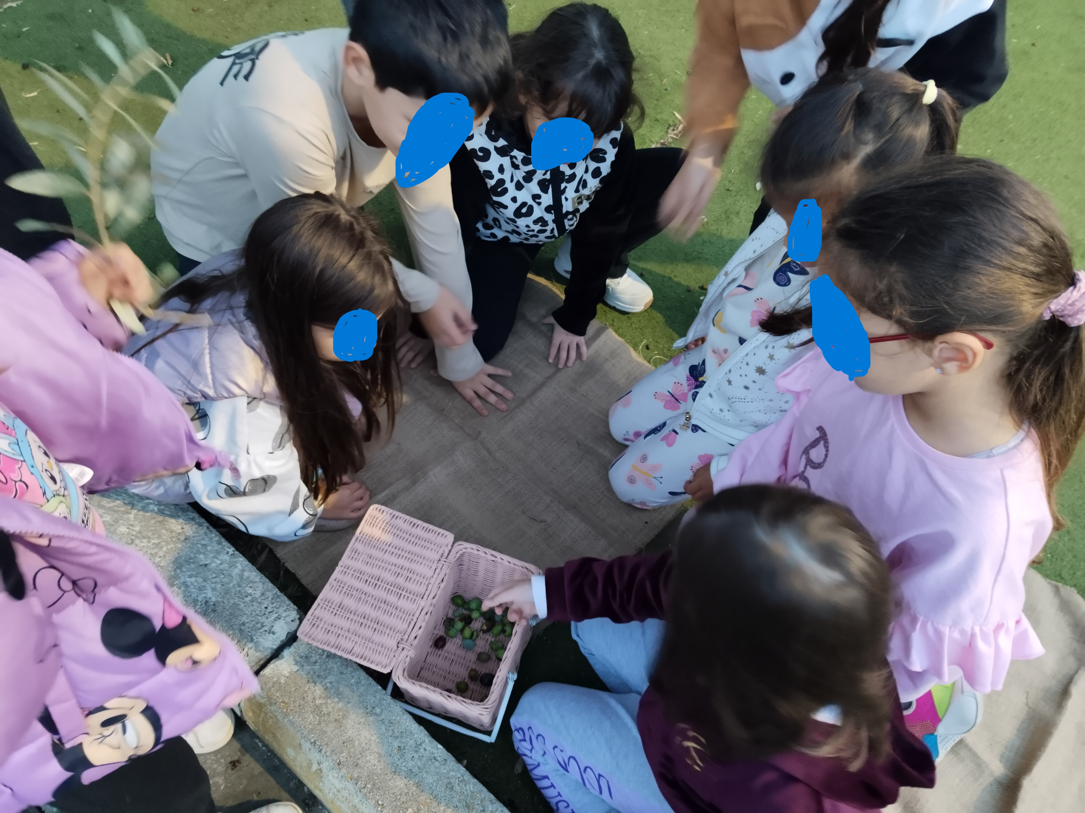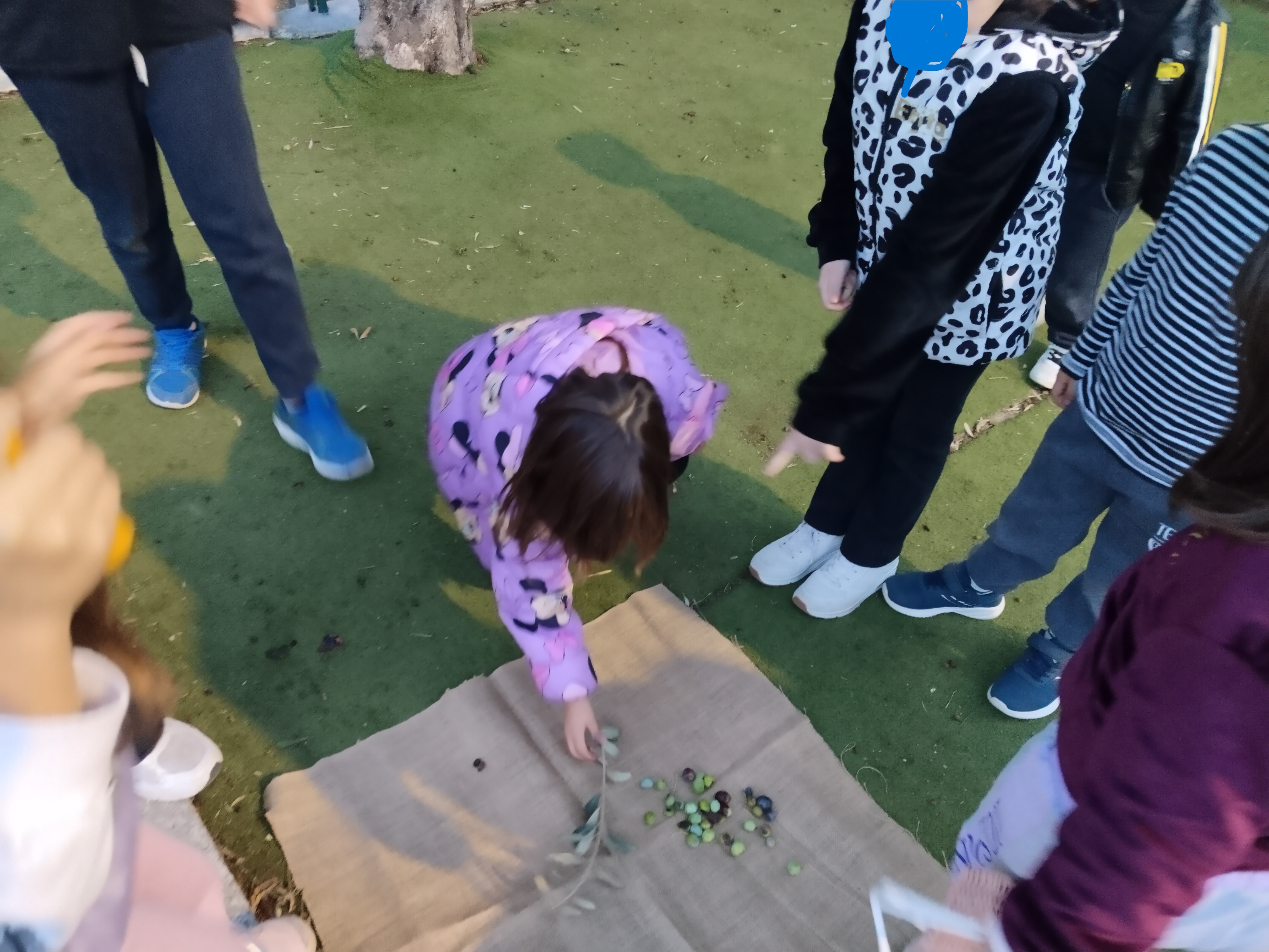 Τα παιδιά, με ενθουσιασμό, άπλωσαν τα πανάκια τους, χτύπησαν τα κλαδιά με τις μικρές τους βέργες και συνέλεξαν τον πολύτιμο καρπό της ελιάς, αναπαριστώντας το παραδοσιακό μάζεμα. Στη συνέχεια, μάζεψαν τις ελιές τους στο καλαθάκι, μπήκαν στην τάξη και παρατήρησαν πώς, ζουλώντας τον καρπό, παράγεται το λάδι.