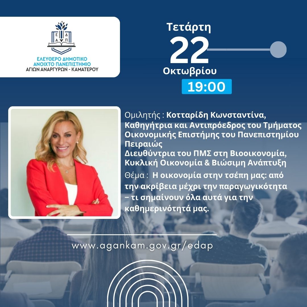 Σας ενημερώνουμε ότι η δεύτερη συνεδρία του χειμερινού κύκλου σπουδών θα πραγματοποιηθεί την Τετάρτη 22 Οκτωβρίου και ώρα 19.00 στο 1ο Δημοτικό σχολείο Αγίων Αναργύρων.  Εισηγήτρια θα είναι η καθηγήτρια του Πανεπιστημίου Πειραιώς Κωνσταντίνα Κοτταρίδη και το θέμα της διάλεξης θα είναι: «Η οικονομία στην τσέπη μας: από την ακρίβεια μέχρι την παραγωγικότητα. Τι σημαίνουν όλα αυτά για την καθημερινότητά μας».