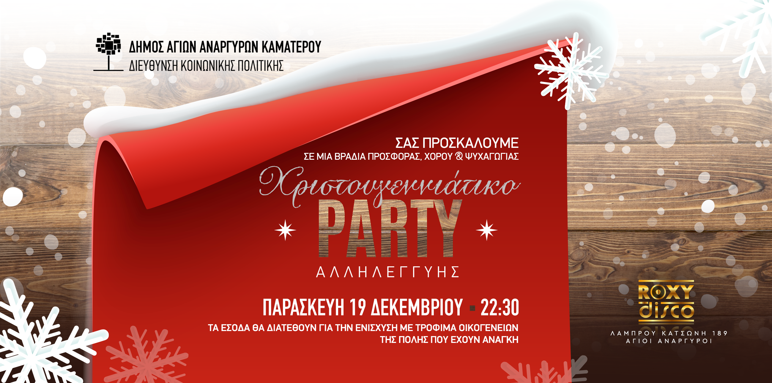 Σας ενημερώνουμε ότι την Παρασκευή 19 Δεκεμβρίου και ώρα 22.30 θα πραγματοποιηθεί το χριστουγεννιάτικο πάρτι αλληλεγγύης στη ντίσκο Roxy στην οδό Λάμπρου Κατσώνη στους Αγίους Αναργύρους. Τα έσοδα που θα συγκεντρωθούν θα διατεθούν για την αγορά τροφίμων.