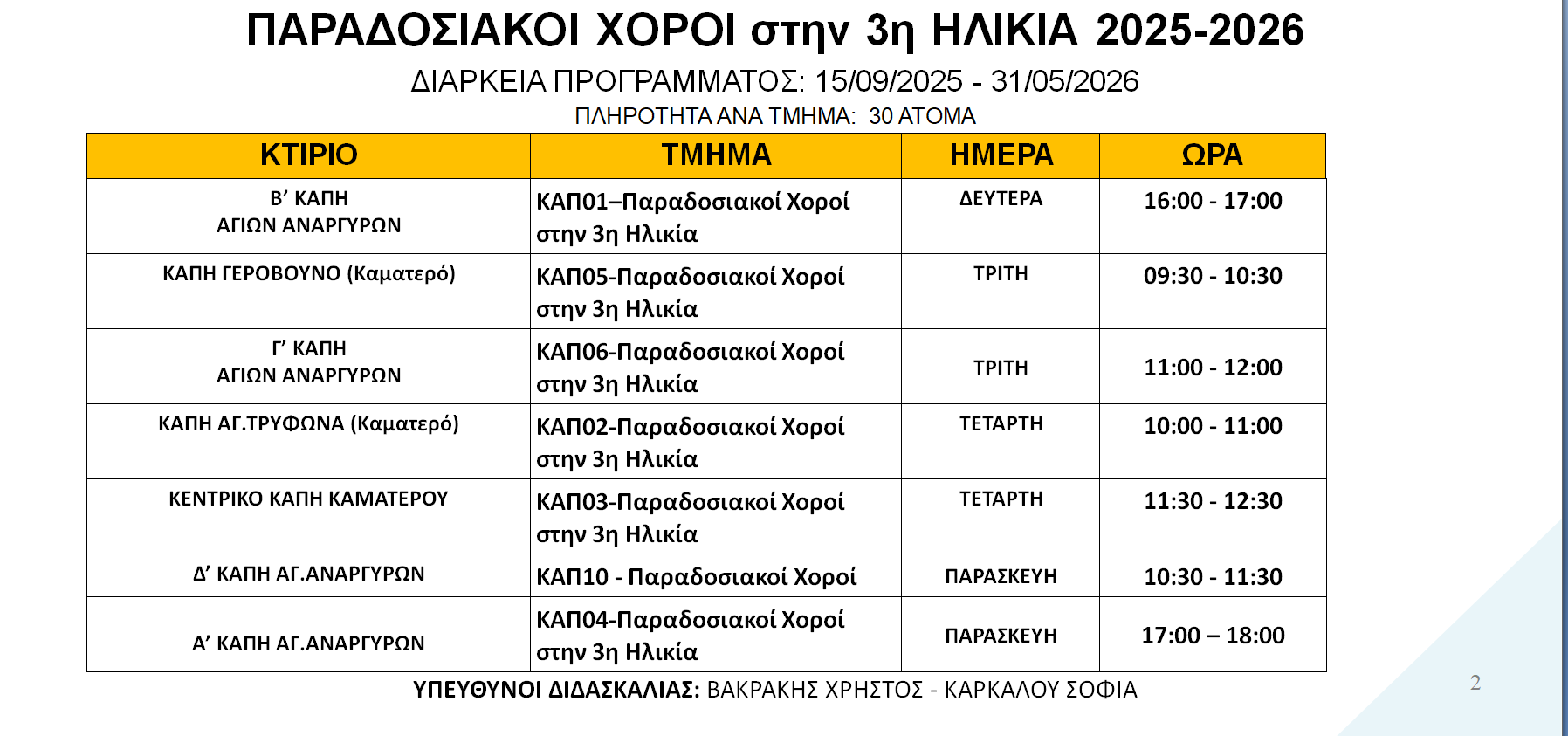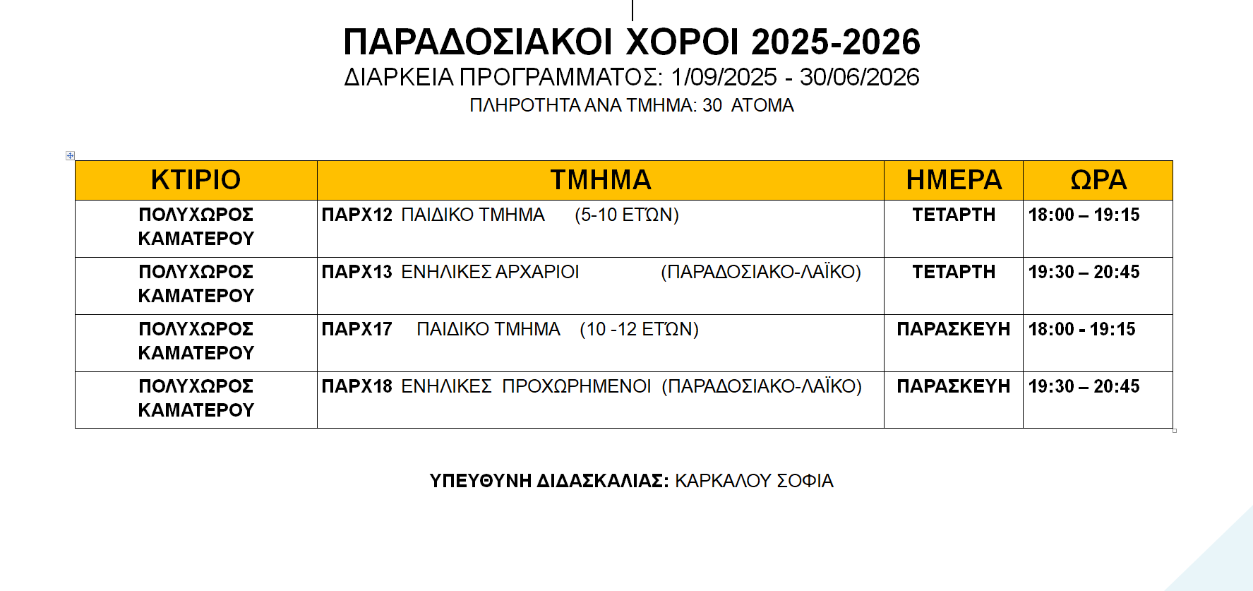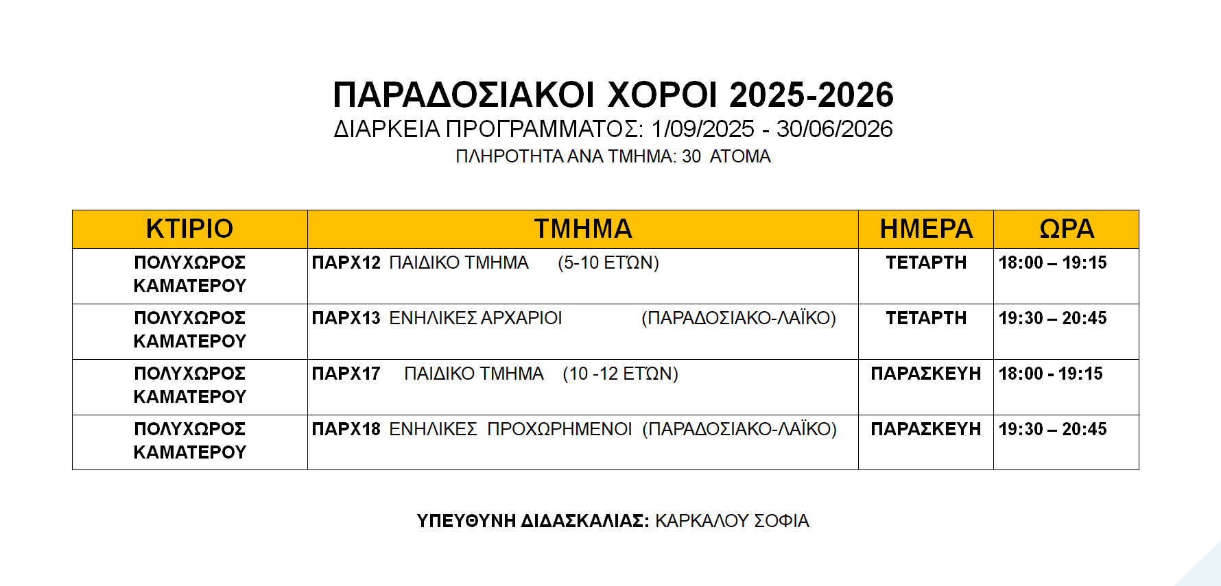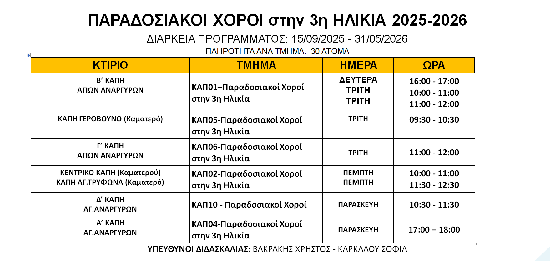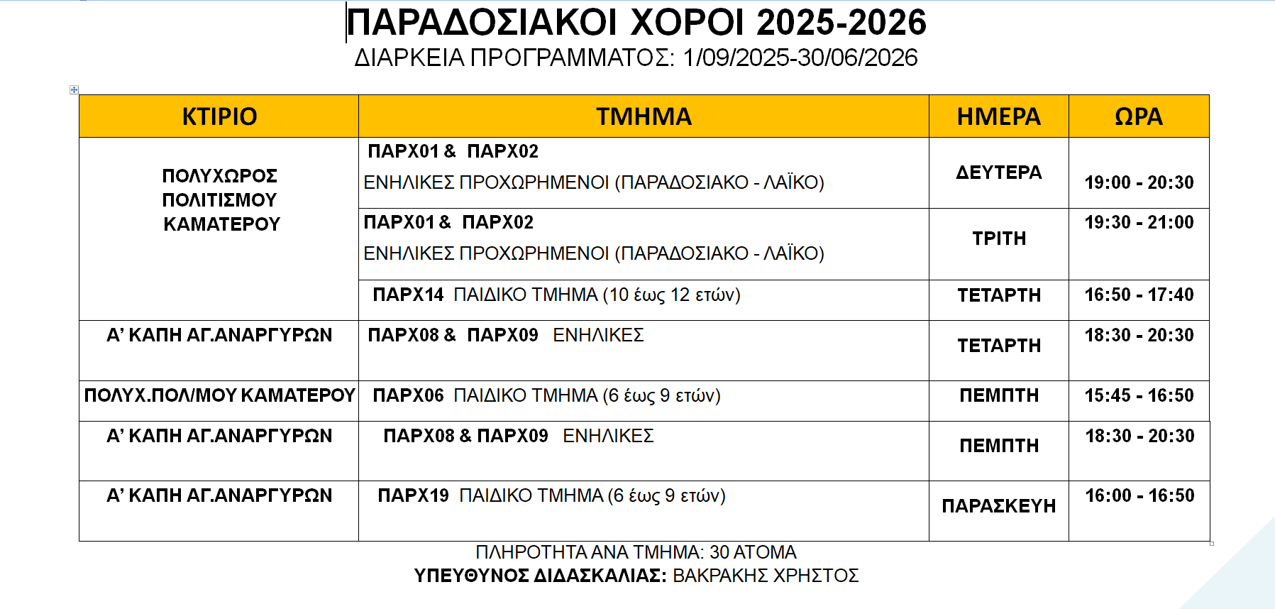 Ο Δήμος Αγ.Αναργύρων-Καματερού είναι απο τους πρωτοπόρους δήμους που δημιούργησε τμήμα ελληνικών παραδοσιακών χορών. Στο πέρασμα των χρόνων πολλοί είναι αυτοί που έμαθαν παραδοσιακό χορό και μυήθηκαν στα ήθη και έθιμα της πατρίδας μας. Ομάδες νηπίων, παιδιών, εφήβων, ενηλίκων και τρίτης ηλικίας απαρτίζουν το τμήμα αυτό, μαθαίνοντας δημοτικούς χορούς απο την ηπειρωτική και νησιωτική Ελλάδα, τη Μικρά Ασία και την Κύπρο, καθώς και αστικολαϊκούς χορούς (χασάπικα, ζεϊμπέκικα, Απτάλικα, καρσιλαμάδες κ.α.)