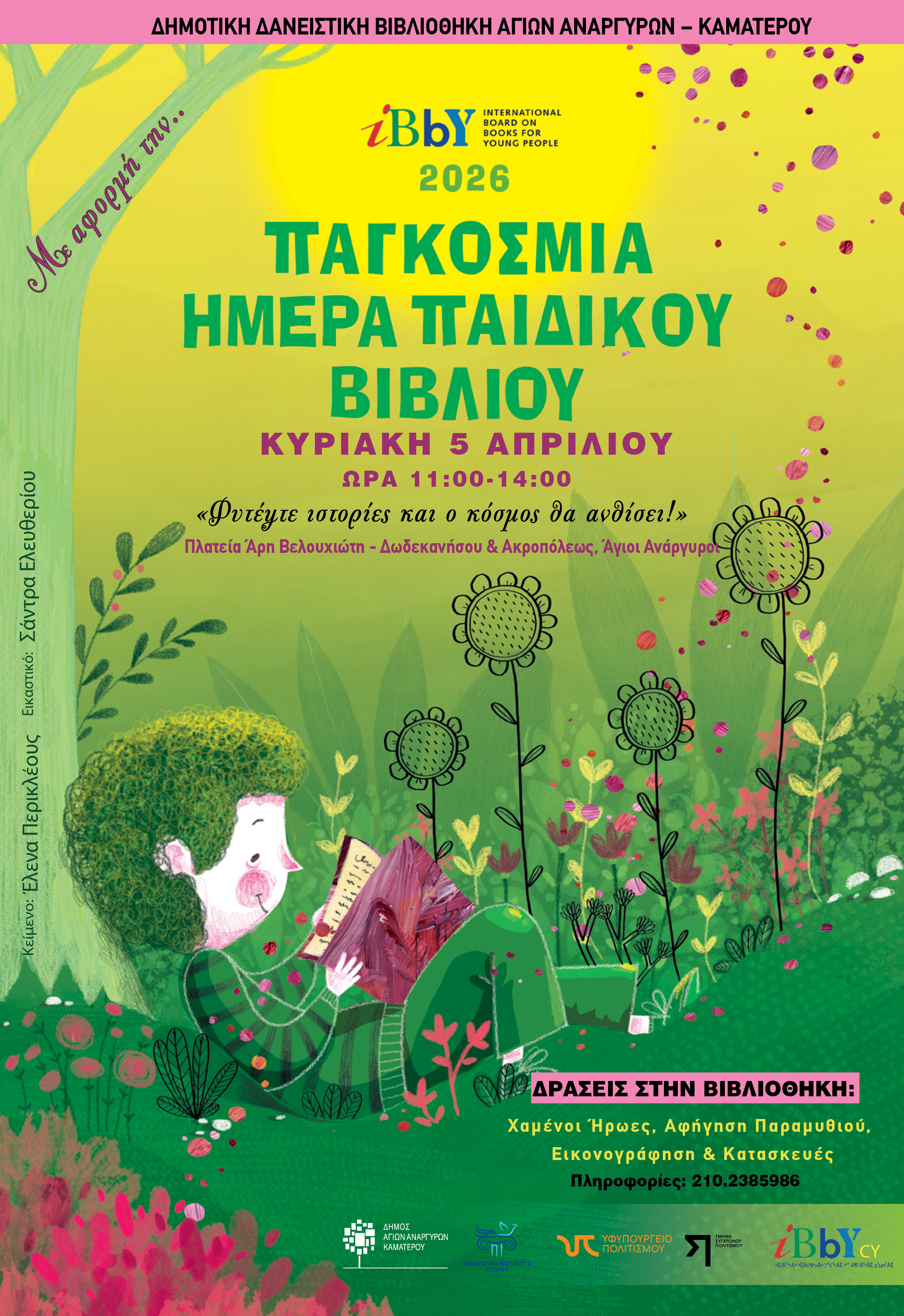 Σας ενημερώνουμε ότι με αφορμή την Παγκόσμια Ημέρα Παιδικού Βιβλίου στις 2 Απριλίου, θα πραγματοποιηθούν δράσεις για το βιβλίο στη Δημοτική Δανειστική Βιβλιοθήκη στην πλατεία Άρη Βελουχιώτη την Κυριακή 5 Απριλίου από τις 11.00-14.00.