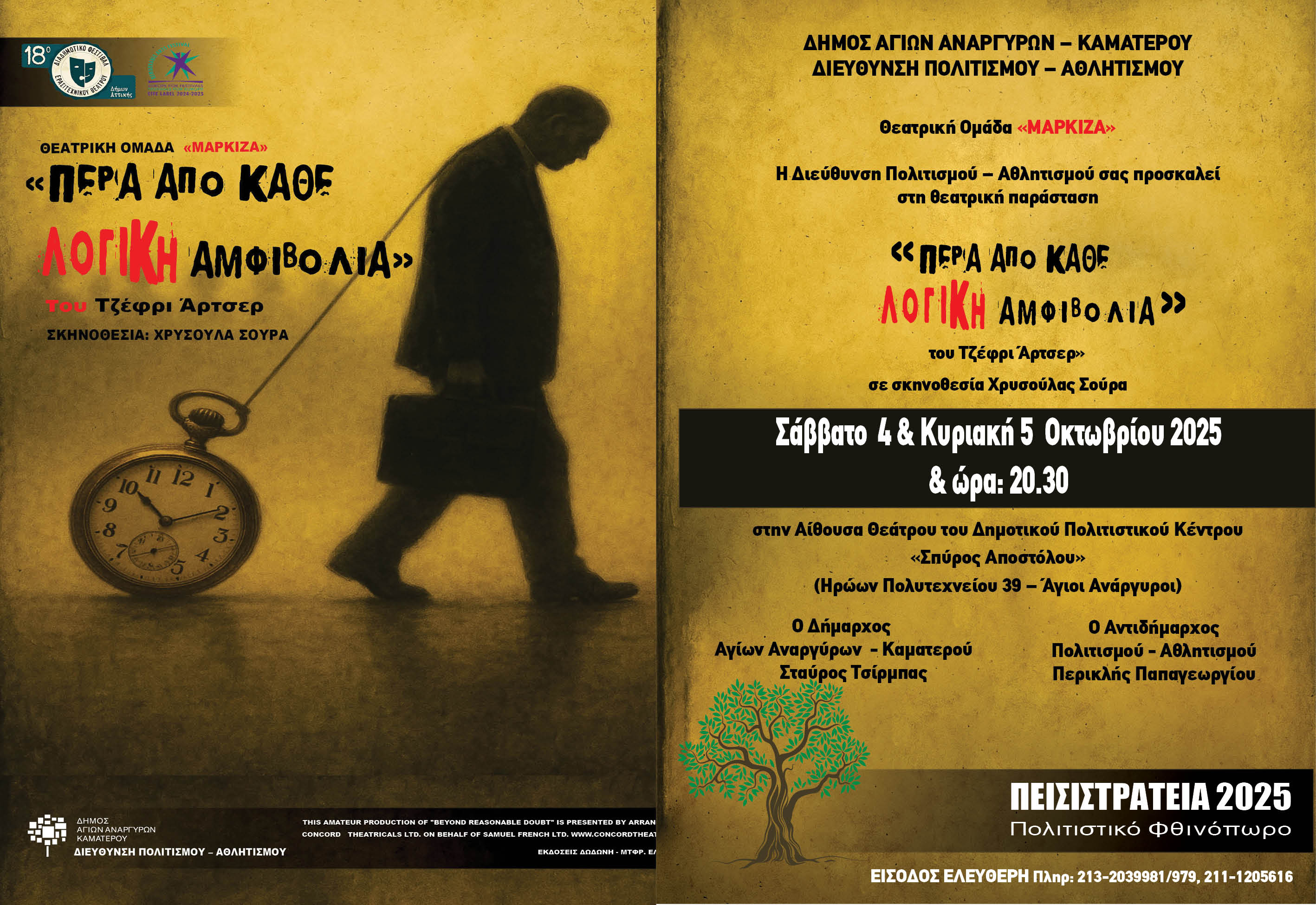 Ενημερώνουμε ότι το Σάββατο 4 και την Κυριακη 5 Οκτωβρίου 2025 θα πραγματοποιηθεί η θεατρική παράσταση «πέρα από κάθε λογική αμφιβολία», από την θεατρική ομάδα «Μαρκίζα» στο Πολιτιστικό Κέντρο «Σπύρος Αποστόλου».