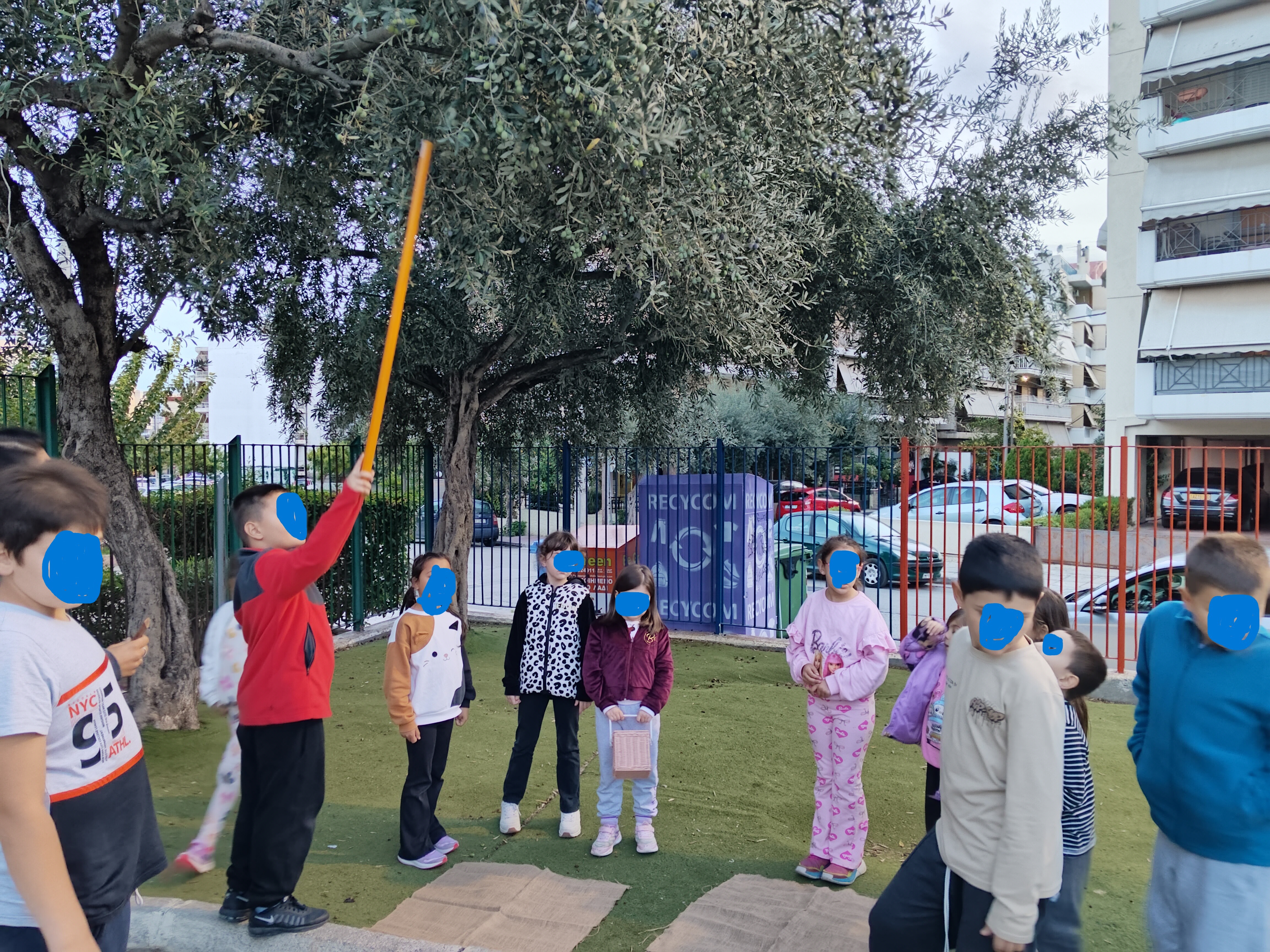 Τα παιδιά, με ενθουσιασμό, άπλωσαν τα πανάκια τους, χτύπησαν τα κλαδιά με τις μικρές τους βέργες και συνέλεξαν τον πολύτιμο καρπό της ελιάς, αναπαριστώντας το παραδοσιακό μάζεμα. Στη συνέχεια, μάζεψαν τις ελιές τους στο καλαθάκι, μπήκαν στην τάξη και παρατήρησαν πώς, ζουλώντας τον καρπό, παράγεται το λάδι.