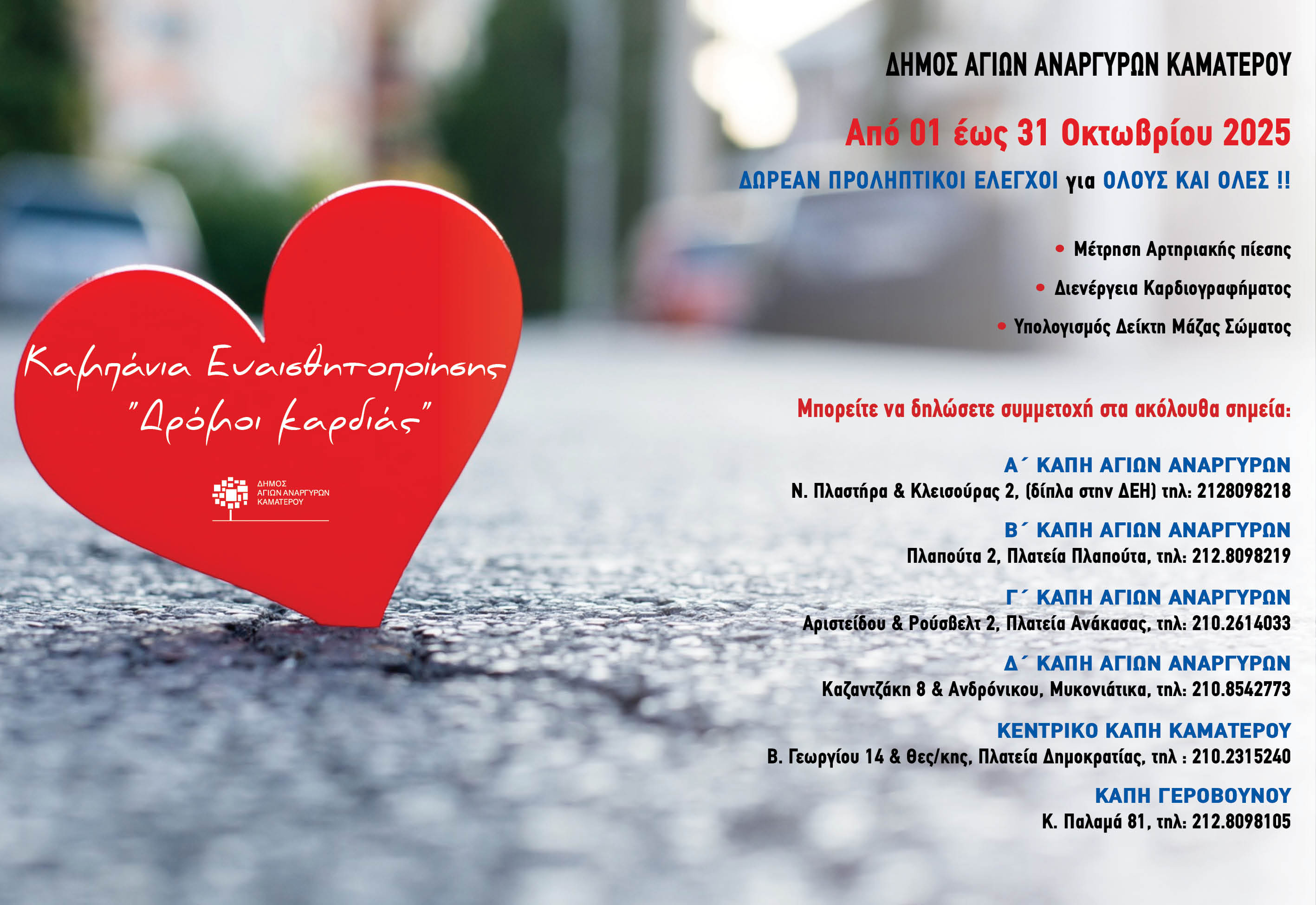 Καμπάνια ευαισθητοποίησης για την καρδιά με δωρεάν προληπτικές εξετάσεις για όλους από 1η έως 31 Οκτωβρίου 2025. Μπορείτε να δηλώσετε συμμετοχή στα παρακάτω σημεία: