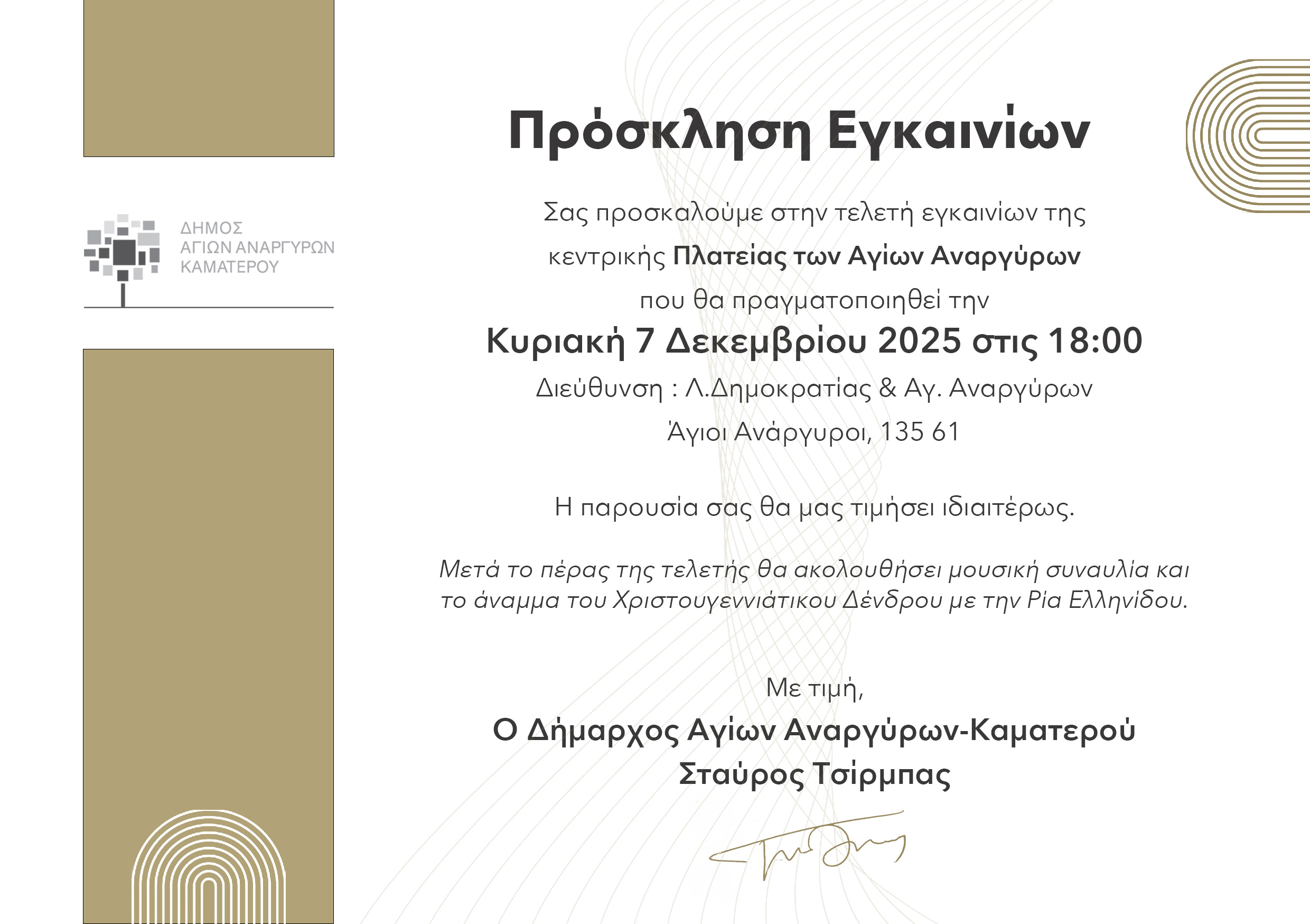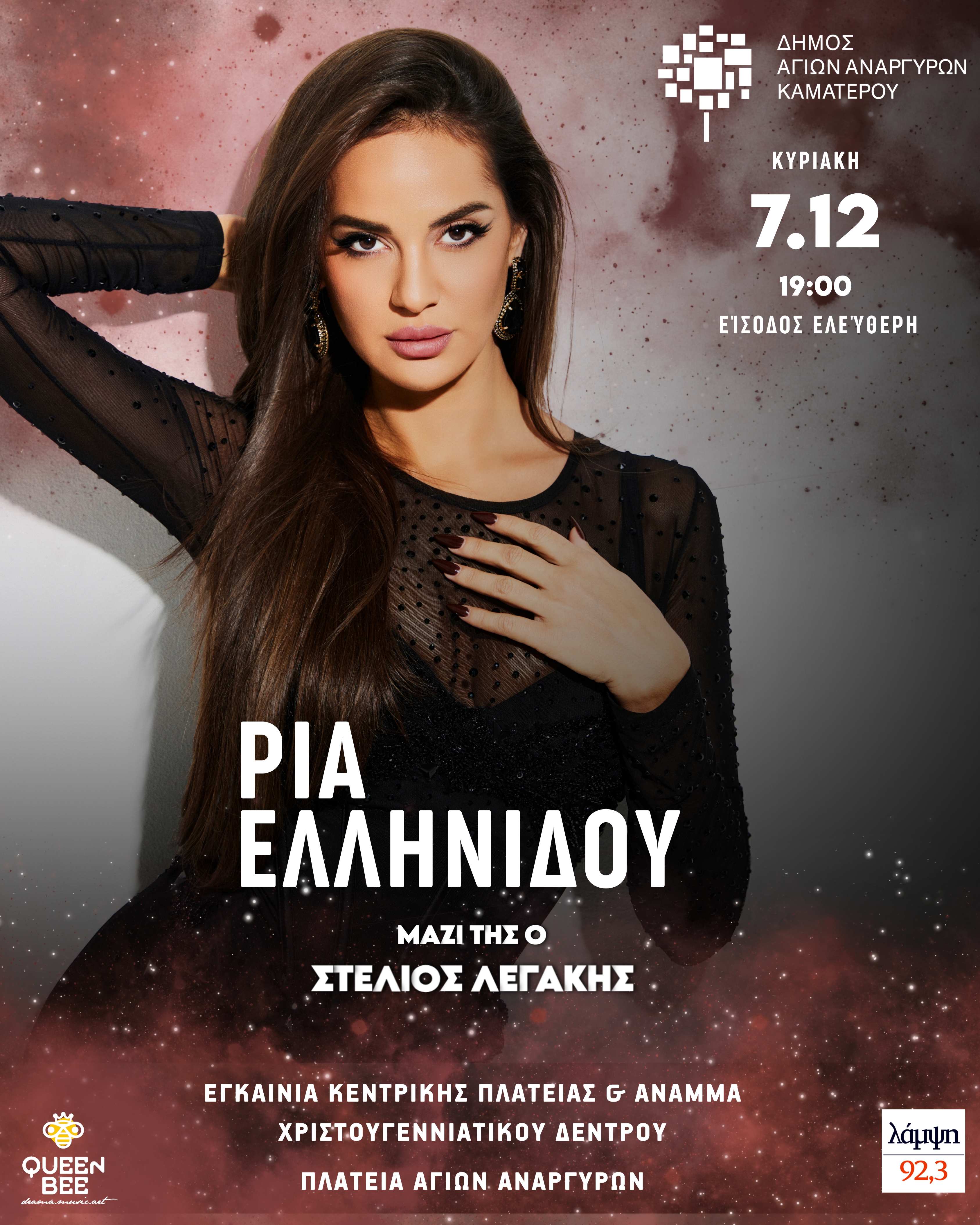 Ενημερώνουμε ότι την Κυριακή 7 Δεκεμβρίου 2025 και ώρα 18:00 θα πραγματοποιηθούν τα εγκαίνια της Κεντρικής Πλατείας των Αγίων Αναργύρων και θα ακολουθήσει η φωταγώγηση του Χριστουγεννιάτικου Δέντρου και μια ξεχωριστή συναυλία με τη Ρία Ελληνίδου!