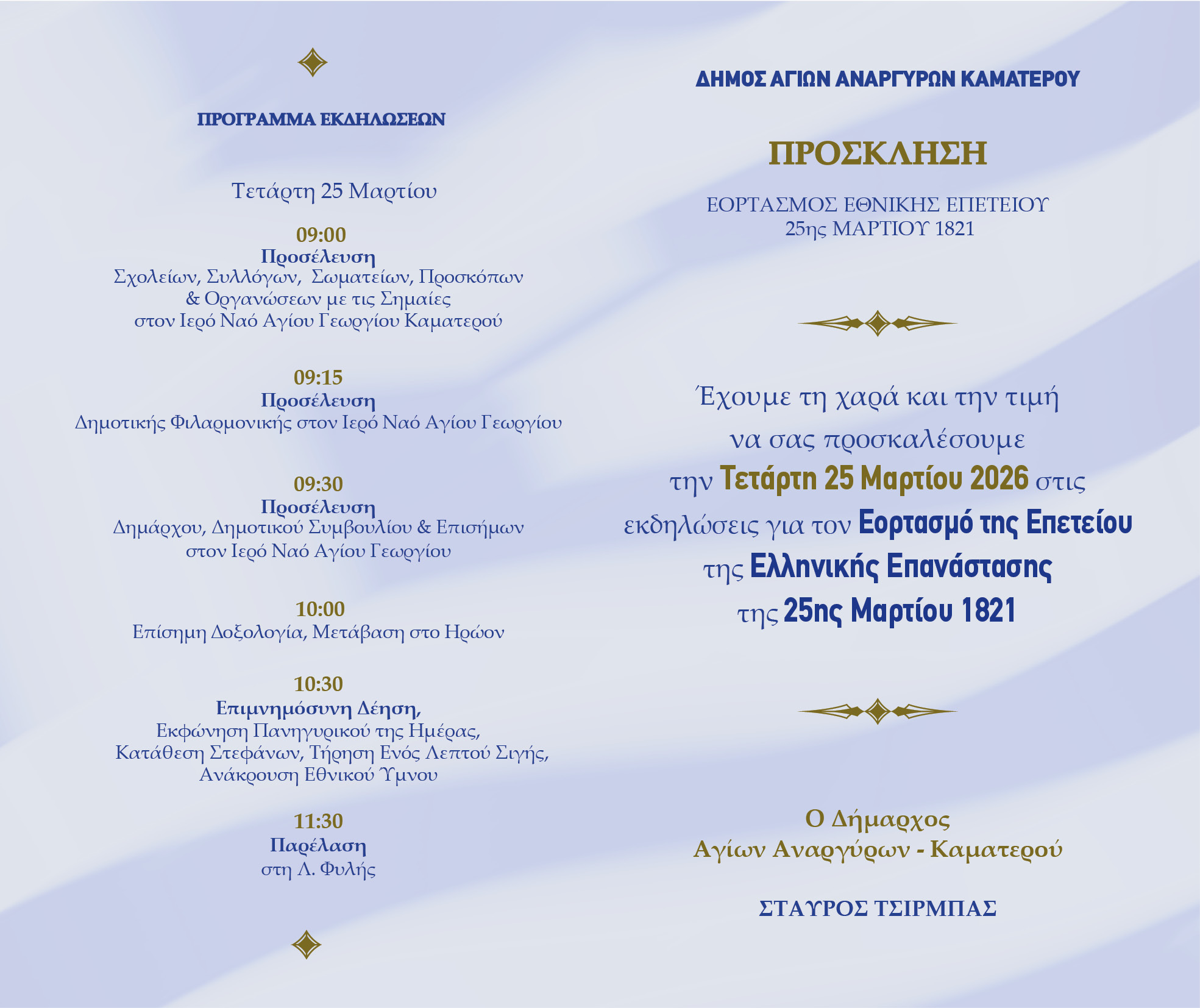 Οι εορτασμοί για την Εθνική Επέτειο της Ελληνικής Επανάστασης της 25ης Μαρτίου 1821 θα πραγματοποιηθούν ανήμερα της επετείου την Τετάρτη 25 Μαρτίου στον Δήμο Αγίων Αναργύρων-Καματερού.