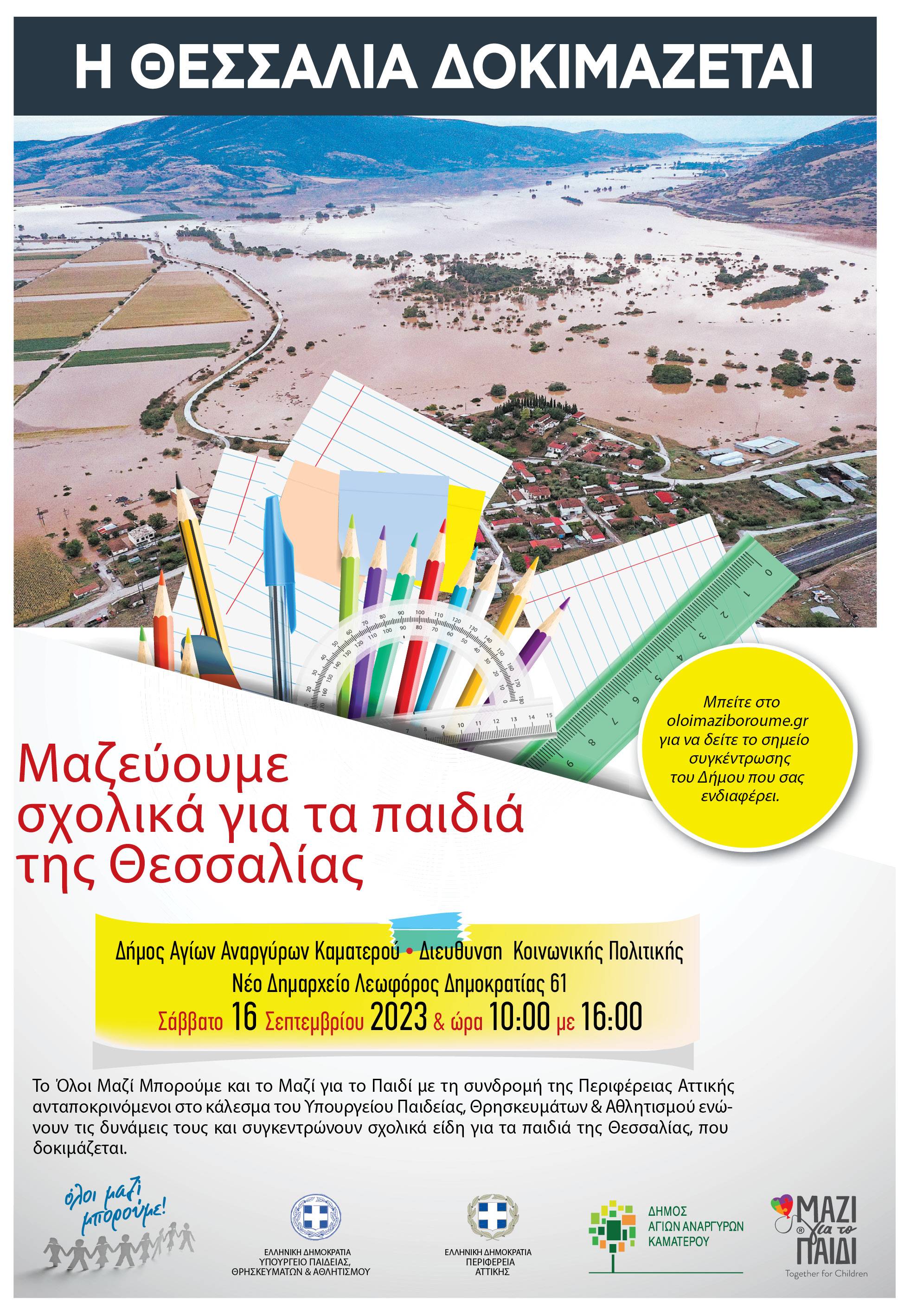 Ο Δήμος Αγίων Αναργύρων-Καματερού μαζί με όλους τους Δήμους της Αττικής και το υπουργείο Παιδείας, Θρησκευμάτων και Αθλητισμού συγκεντρώνουν σχολικά είδη για τα παιδιά της Θεσσαλίας, που δοκιμάζεται, με τη συνδρομή της Περιφέρειας Ατικής.