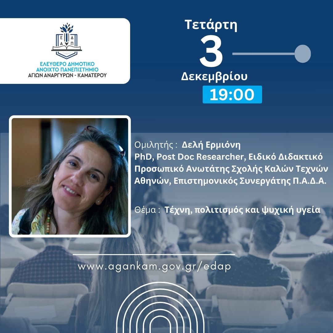 Εισηγήτρια θα είναι η κ. Δελή Ερμιόνη, ειδικό Διδακτικό Προσωπικό της Ανωτάτης Σχολής Καλών Τεχνών και το θέμα της διάλεξης θα είναι: «Τέχνη, πολιτισμός και ψυχική υγεία».